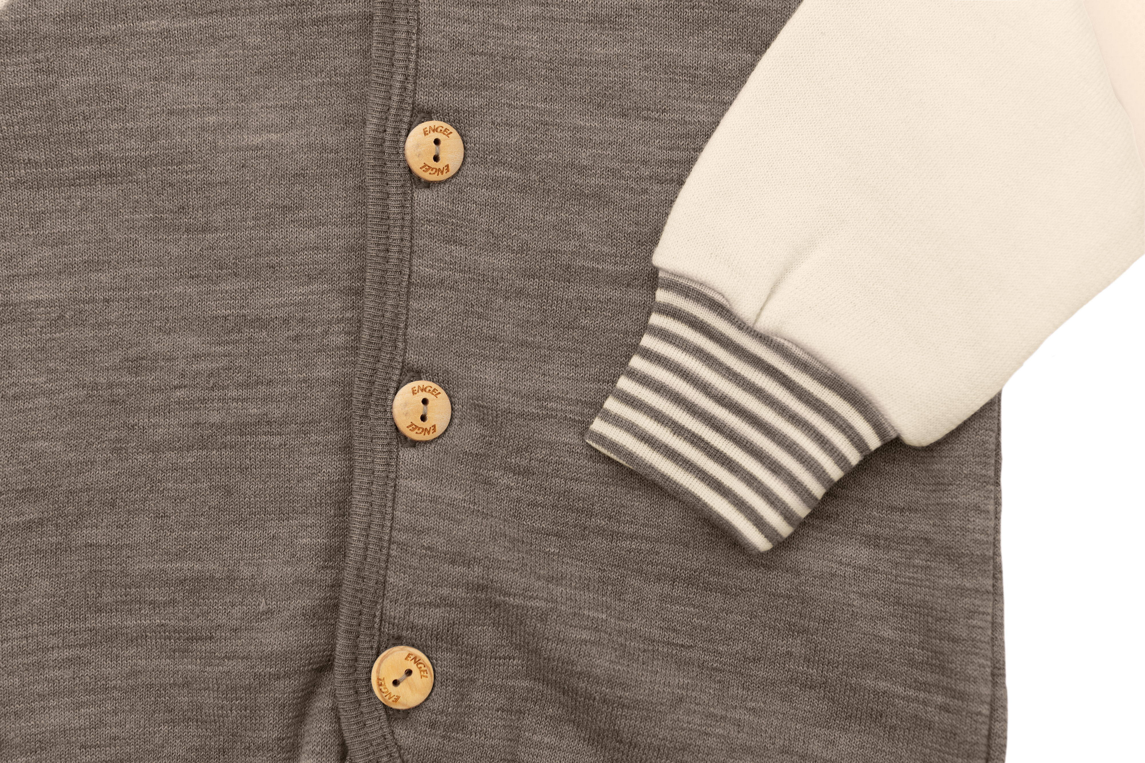 Die Baby-Kapuzenjacke in der Farbe Walnuss-Melange besteht aus flauschigem Schurwoll-Frottee und ist ein optisches wie praktisches Highlight für jede Babyausstattung. Zum gemütlichen Einkuscheln eignen sich der gerade Schnitt und die große Kapuze. Hochwertige Holzknöpfe runden das Design ab. Elastische Säume und breite Bündchen erhöhen den Tragekomfort.