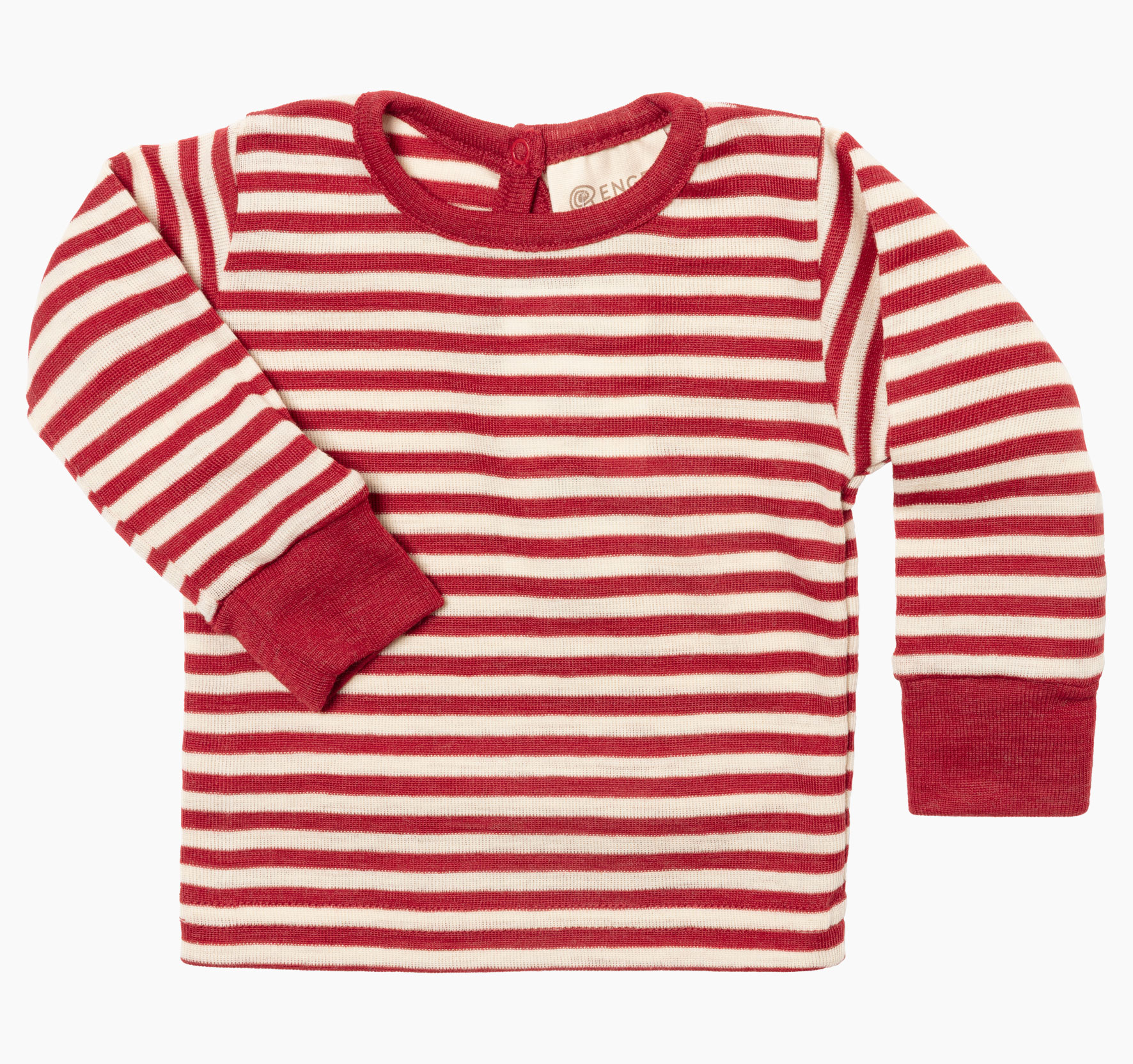 Dieses gestreifte Baby Langarmshirt aus 100% Bio-Merinowolle in den Farben Rot Melange und Natur, ist ein echter Blickfang. Dank des Druckknopfes hinten lässt es sich schnell an- und ausziehen. Outfit-Tipp: Es passt beispielsweise gut zu einer Leggings oder Nabelbundhose.