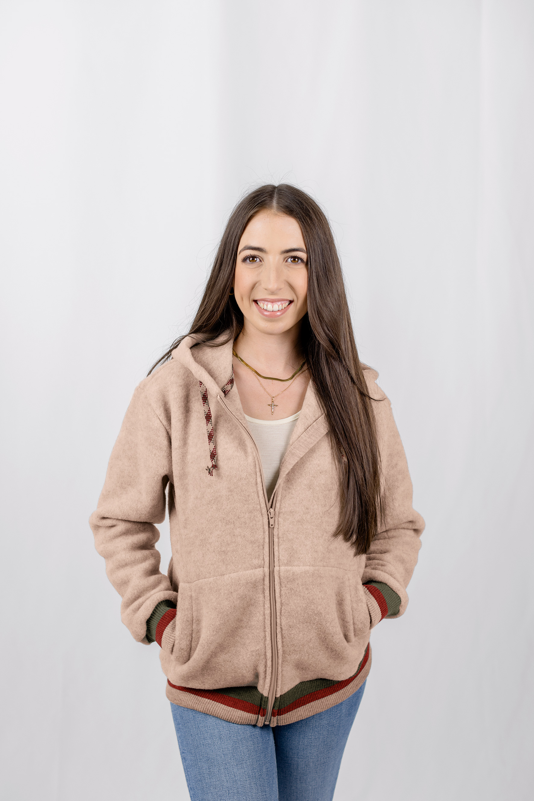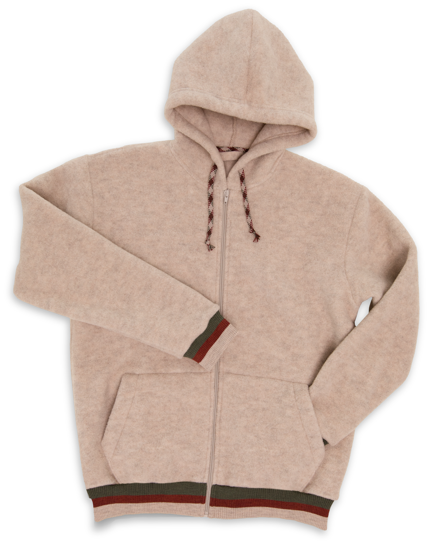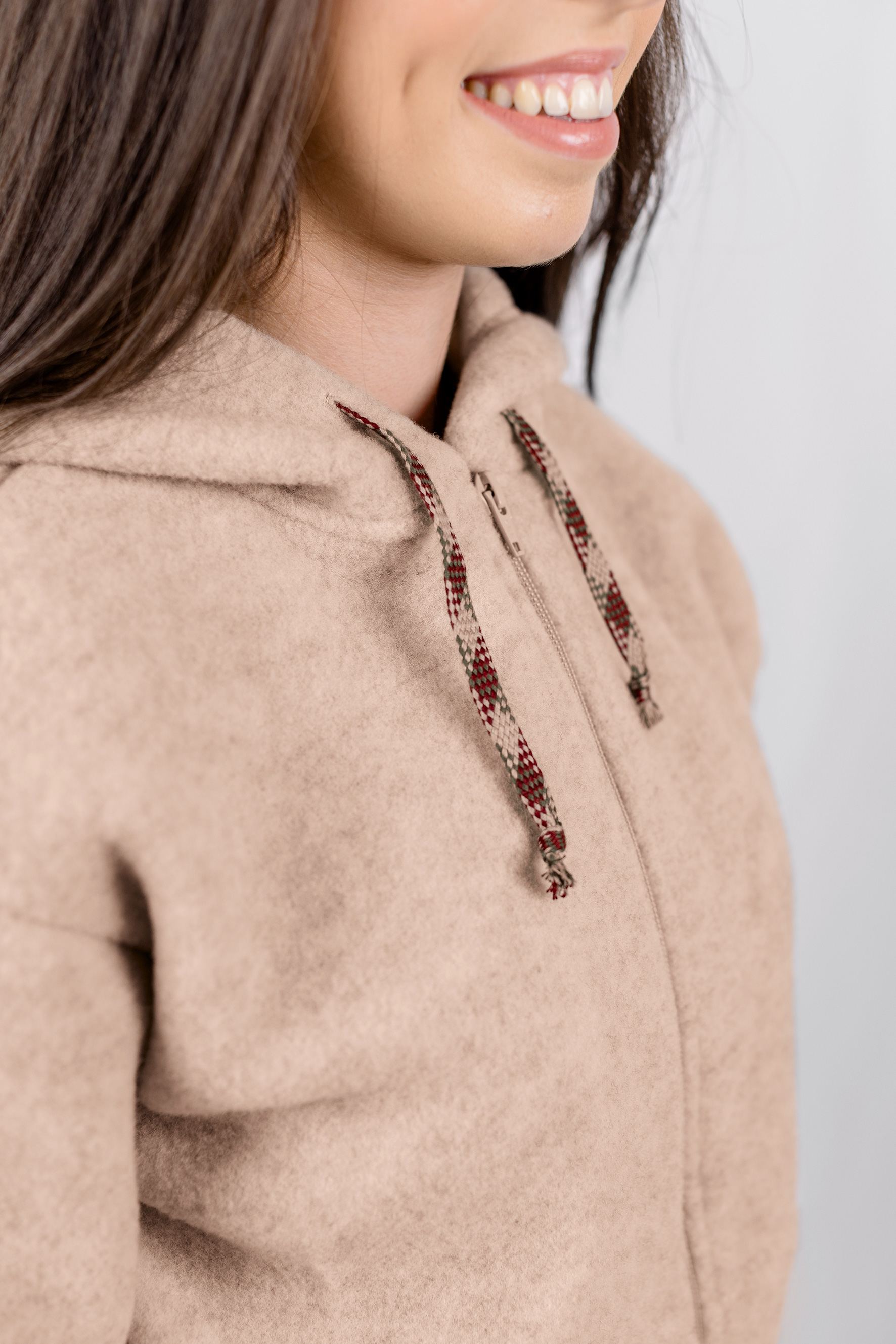Der sportliche Damen-Blouson mit Kapuze und seitlichen Taschen ist aus 100% tierleidfreier Merinoschurwolle. Das dicke Fleece hält rundum warm. Die gestreiften stylischen Bündchen schützen vor kaltem Wind. Perfekt kombinierbar mit Jeans oder Leggings.