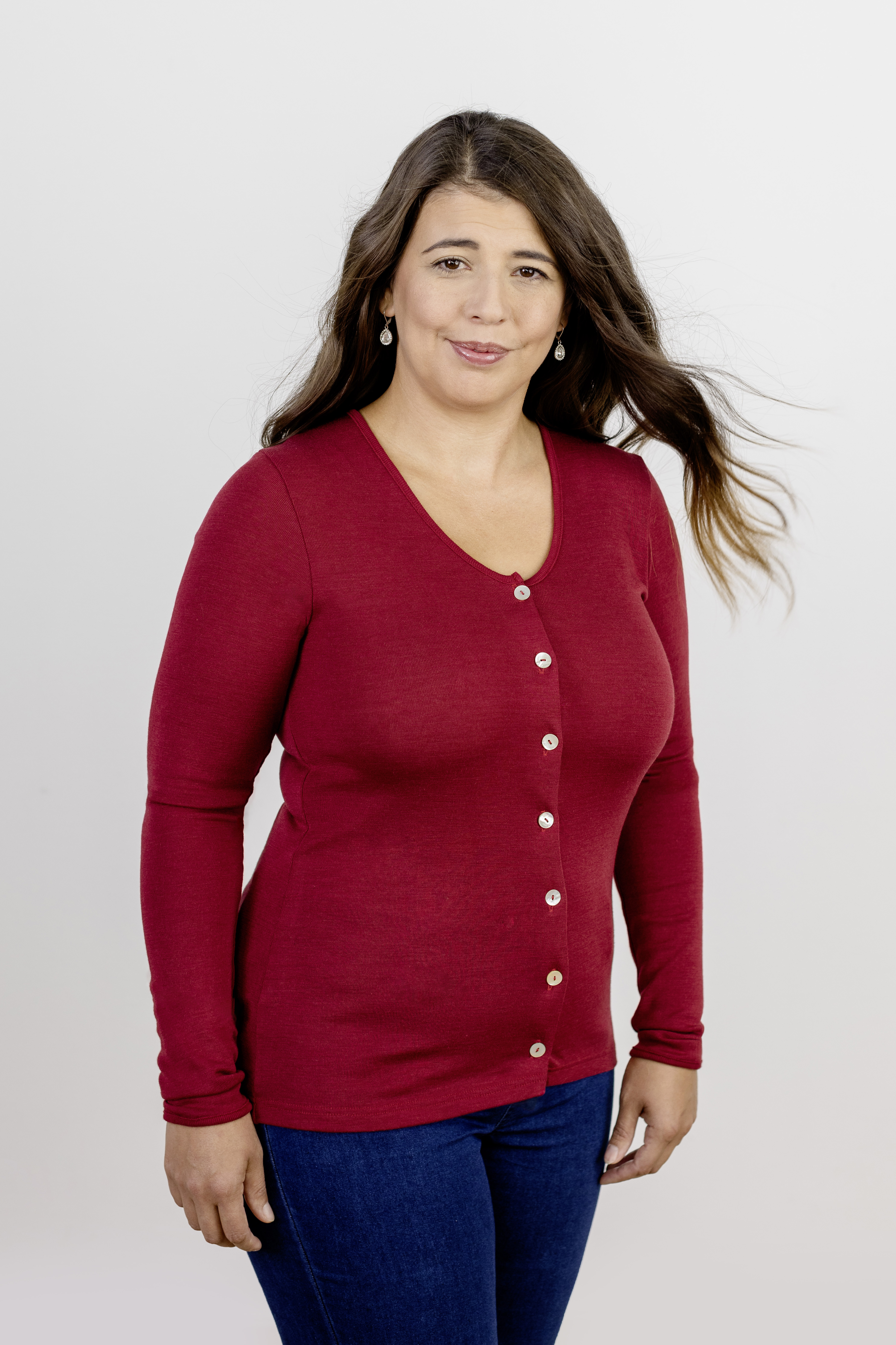 Der Damen Cardigan aus 70% Bio-Merinoschurwolle (aus kontrolliert biologischer Tierhaltung) und 30% Seide in zeitlosem Design in das perfekte Basicteil, was sich zu vielen Outfits kombinieren lässt. Hingucker ist die Perlmuttknopfleiste. Der Wolle-Seide-Mix sorgt für ein gesundes Hautklima, ist atmungsaktiv und temperaturausgleichend. Outfit-Tipp: Darunter passt z.B. das Langarmshirt aus Wolle/Seide.