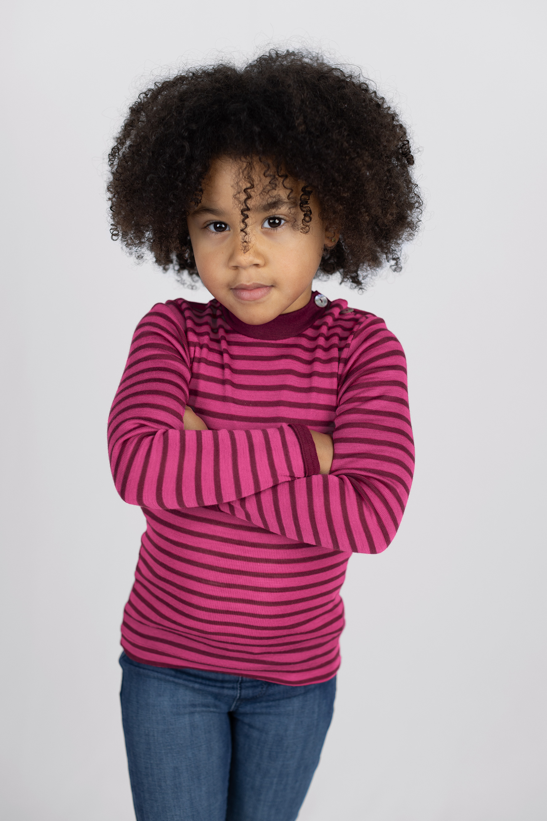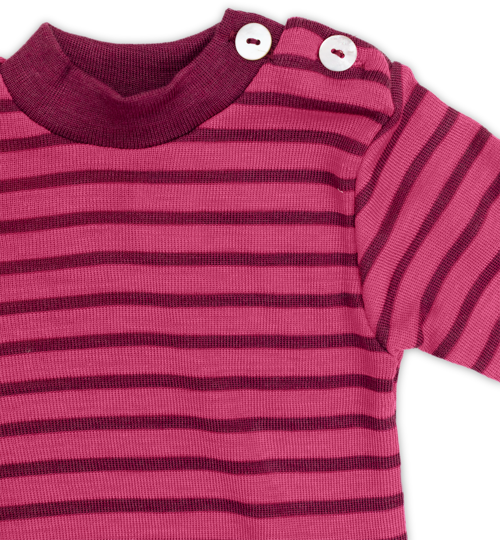 The long-sleeved baby shirt made of 70% organic virgin wool and 30% silk doubles up as a base layer on cold days in autumn and winter or as pull-over. The cute stand-up collar ensures that your baby is well wrapped up. The mother-of-pearl buttons in the shoulder area make for quick and easy dressing and undressing.