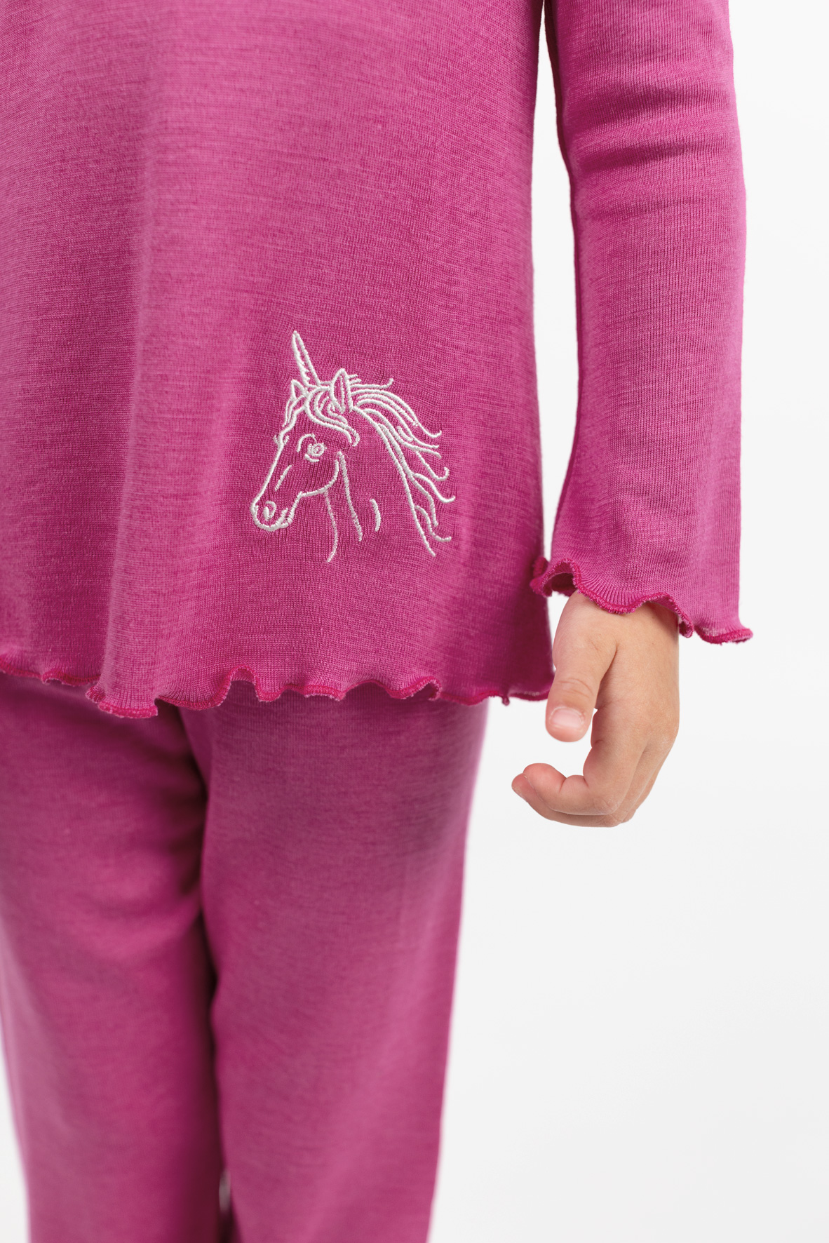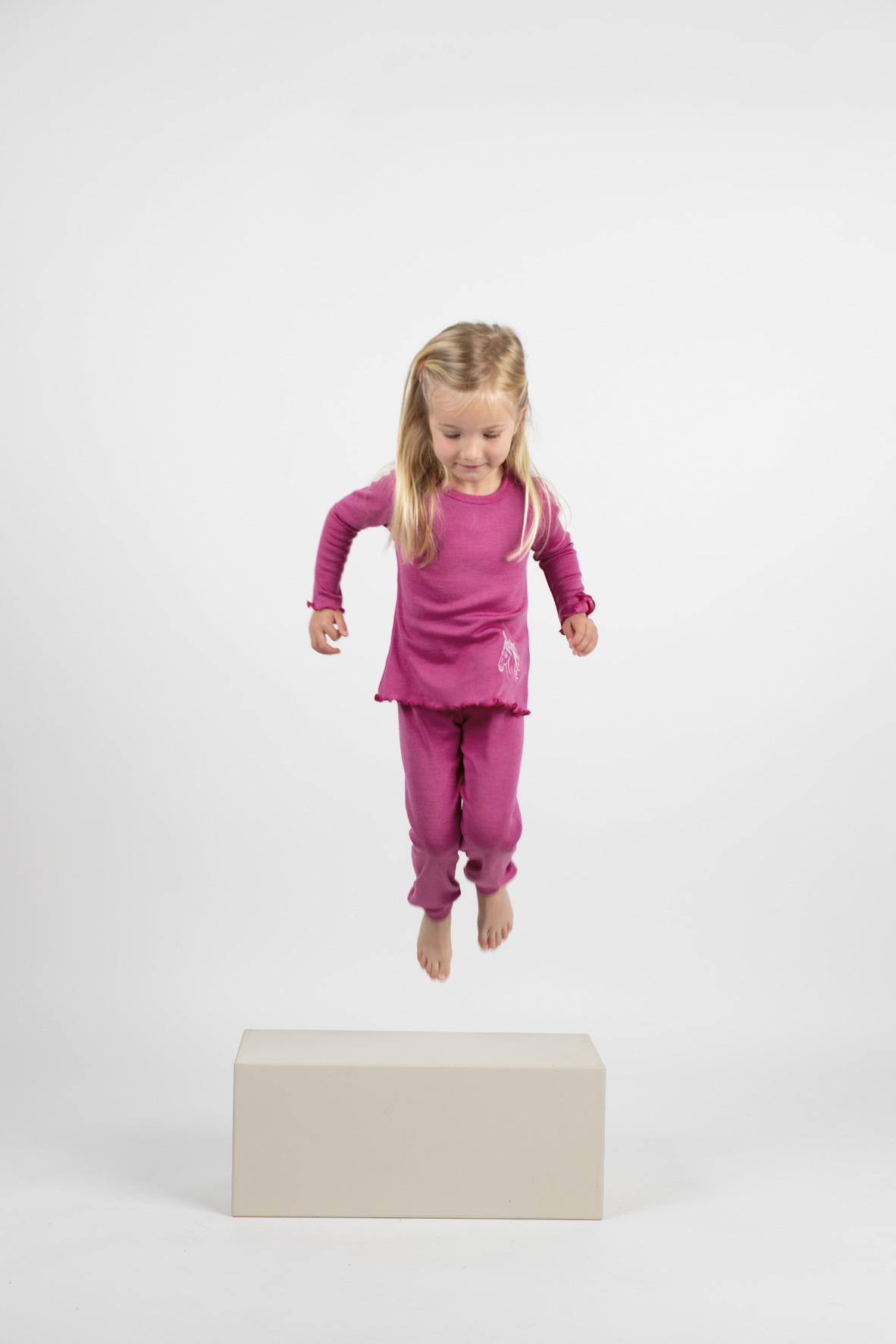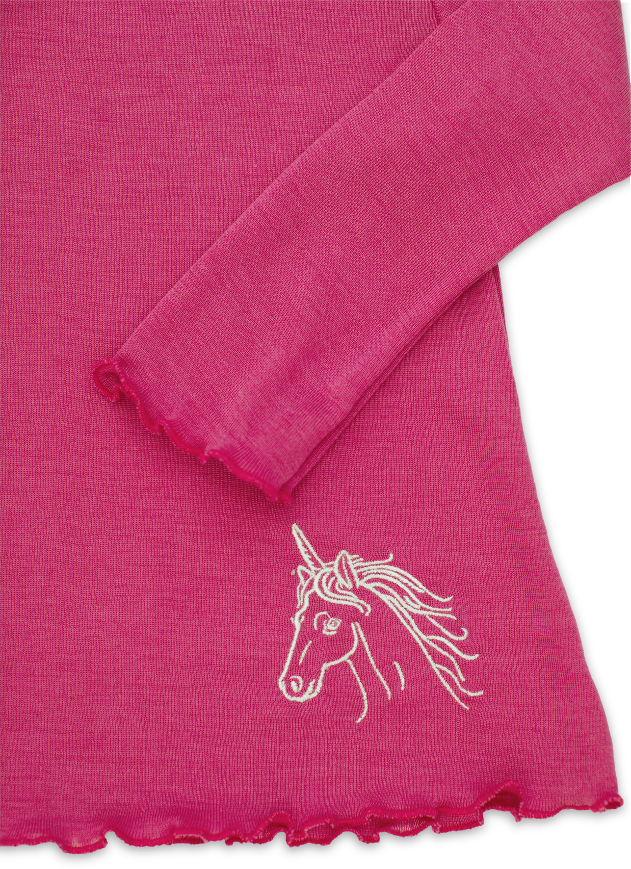 Whether for sleeping or as jumper during the day: the children's pyjama top made of 70 % organic merino virgin wool and 30 % silk is not only particularly soft, but also a true eye-catcher with the embroidered unicorn. In the colour raspberry, it is a must-have for little unicorn fans.