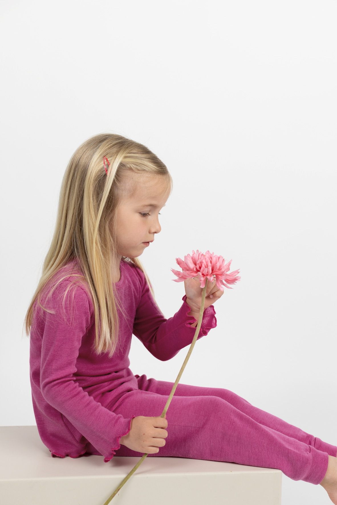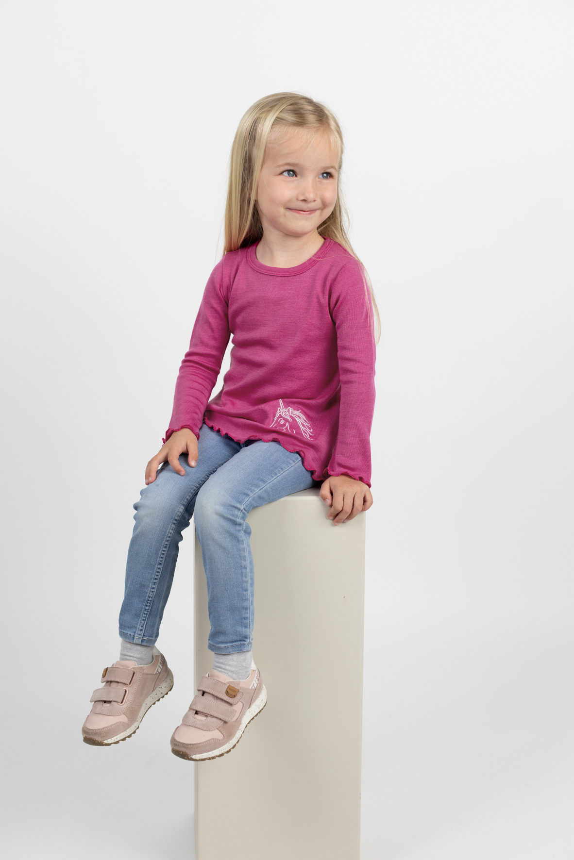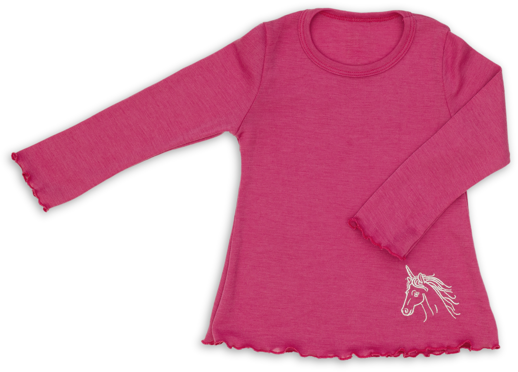 Whether for sleeping or as jumper during the day: the children's pyjama top made of 70 % organic merino virgin wool and 30 % silk is not only particularly soft, but also a true eye-catcher with the embroidered unicorn. In the colour raspberry, it is a must-have for little unicorn fans.