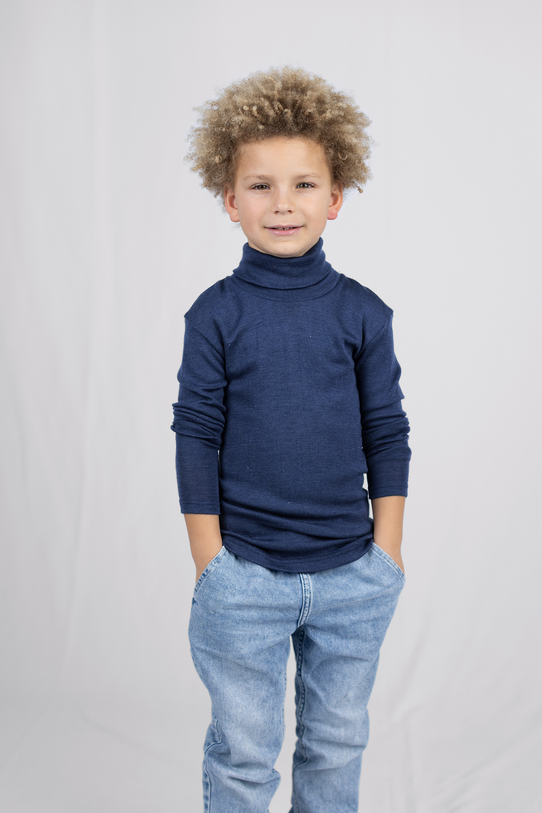 The classic: the children's turtle neck made of 70 % organic virgin wool and 30 % silk is soft and breathable at the same time. Perfect for the cold season and also for wearing under other layers, for example under the children's hooded jacket.