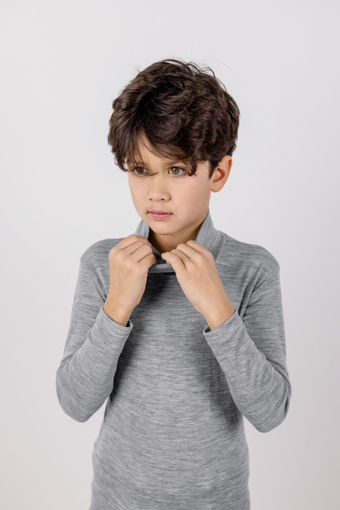 The classic: the children's turtle neck made of 70 % organic virgin wool and 30 % silk is soft and breathable at the same time. Perfect for the cold season and also for wearing under other layers, for example under the children's hooded jacket.