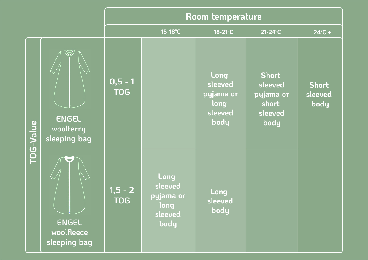 The following table shows you which TOG values are suitable for which room temperatures and what clothing your baby can wear underneath: