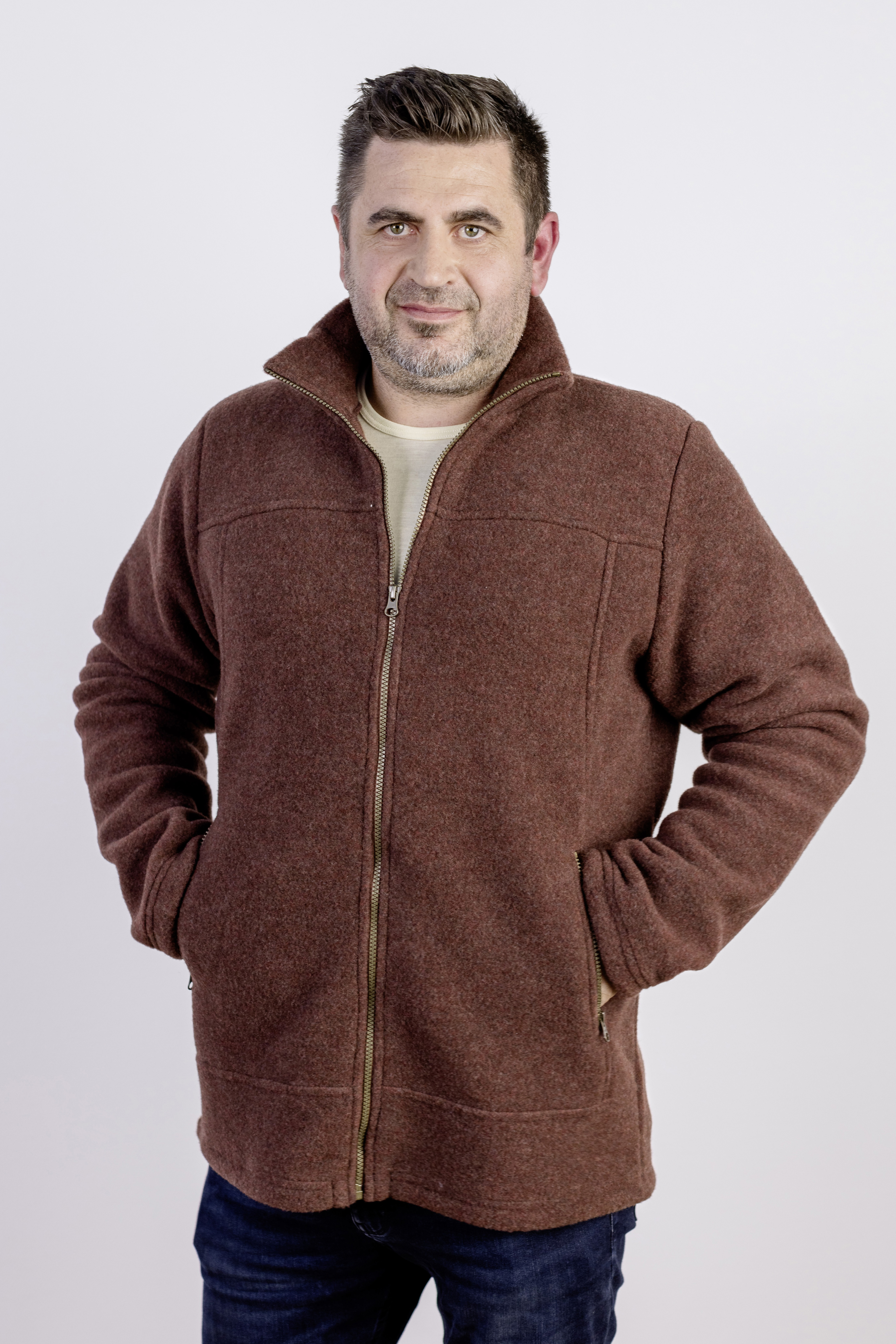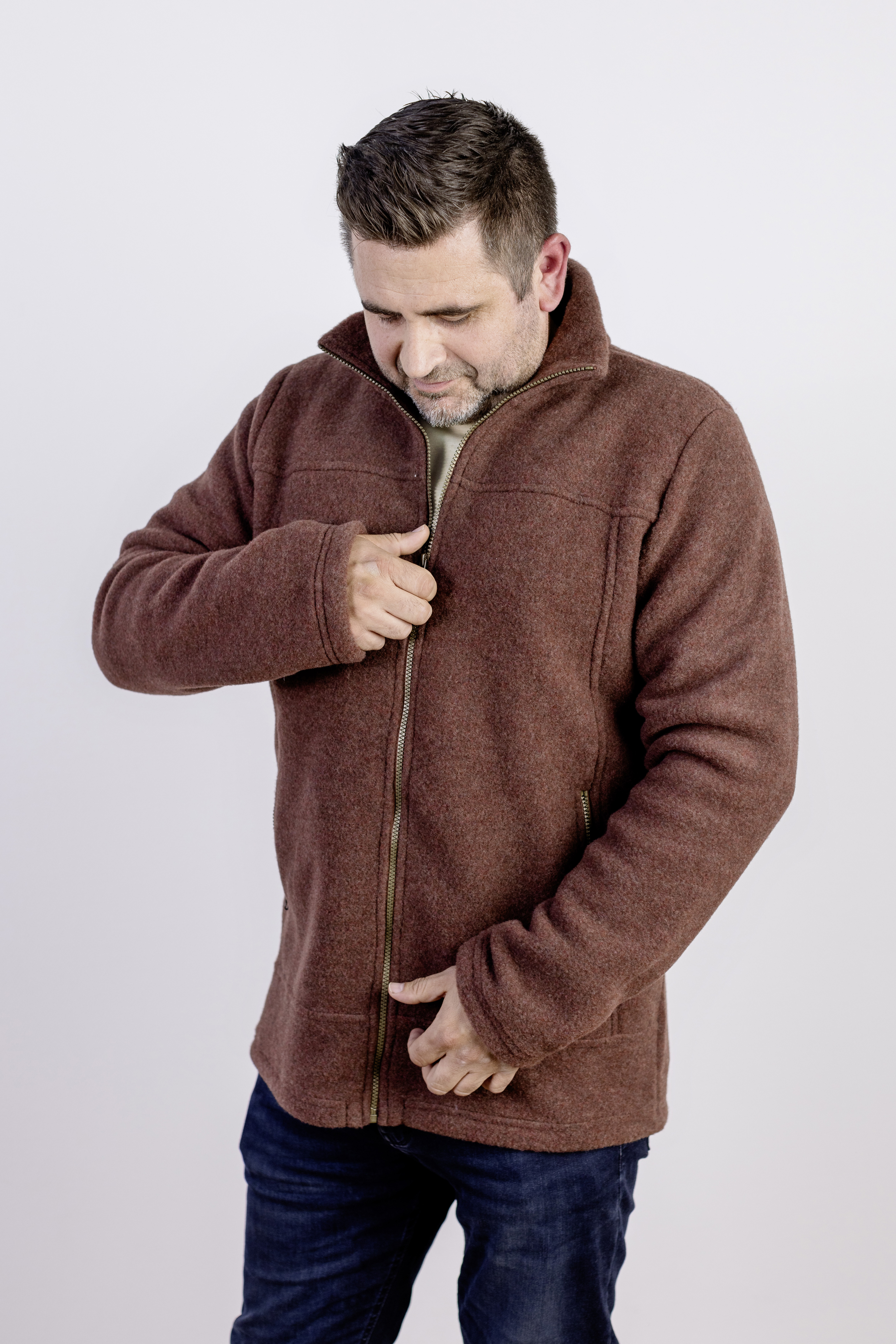 Die Herren-Jacke aus 100% Bio-Merinoschurwolle aus kontrolliert biologischer Tierhaltung (kbT) mit Taschen hält dank des dicken Fleecestoffes schön warm. Der Kragen schmiegt sich weich an den Hals und schützt vor kaltem Wind. In verschiedenen Farben lässt sie sich optimal zu Jeans kombinieren.