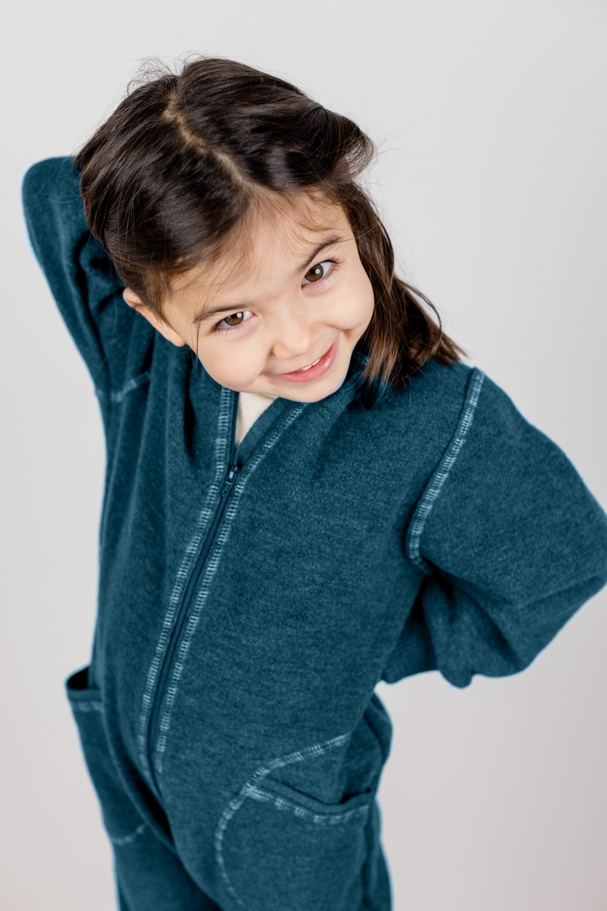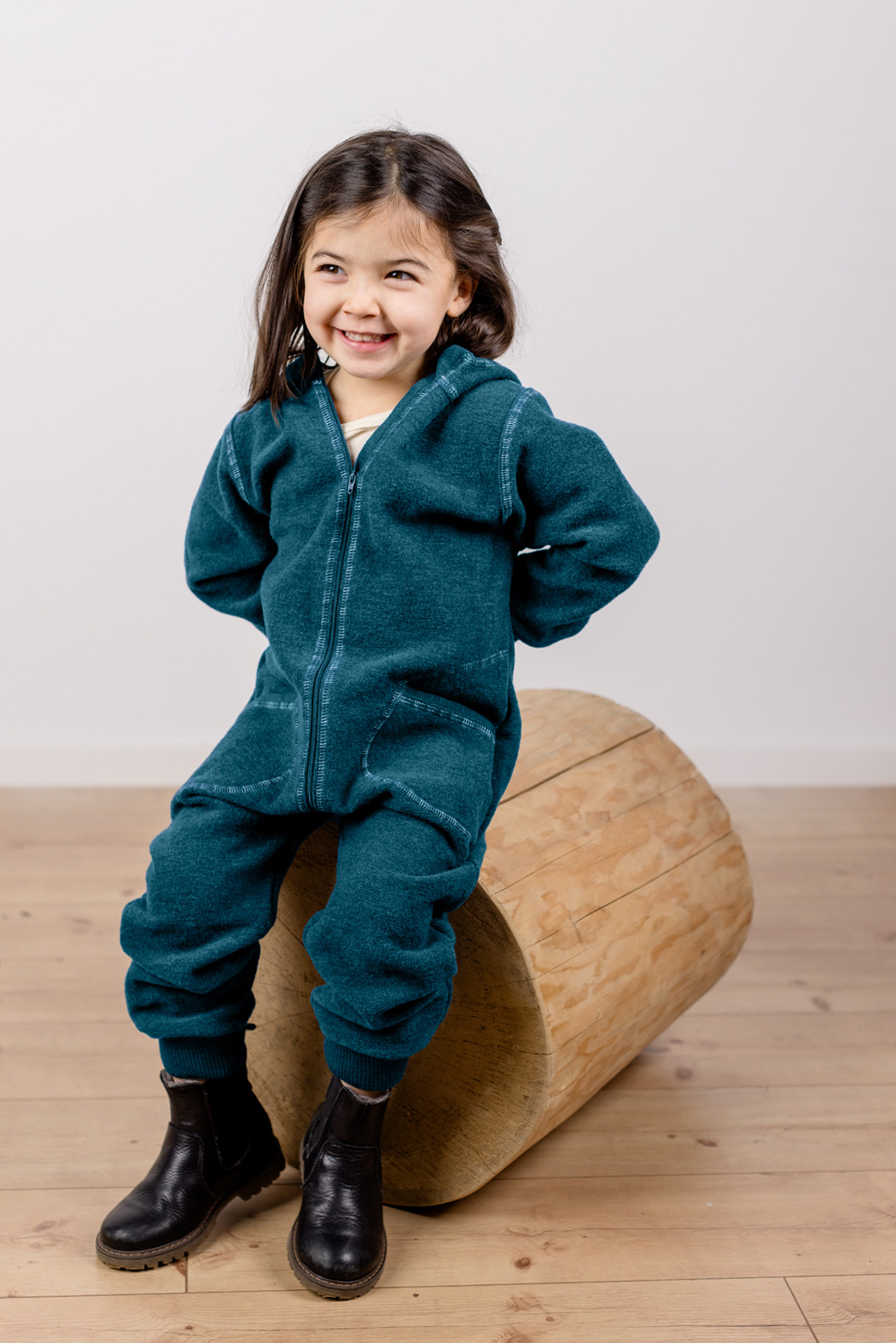 Der Walk-Overall aus 100% Bio-Merinoschurwolle (aus kontrolliert biologischer Tierhaltung) mit Kapuze ist der Allrounder in der kalten Jahreszeit. Walk speichert die Wärme und hält rundum warm - perfekt für kleine Abenteurer*innen, die gern im Freien unterwegs sind! Die großen Taschen an den Seiten bieten ausreichend Platz für Steine und Co. Die Bündchen an den Handgelenken und Beinenden schützen zusätzlich vor kaltem Wind. Mit dem Reißverschluss sind die Kleinen in Sekundenschnelle startklar, wenn's nach draußen gehen soll.