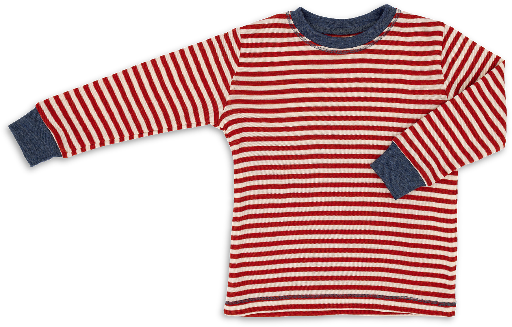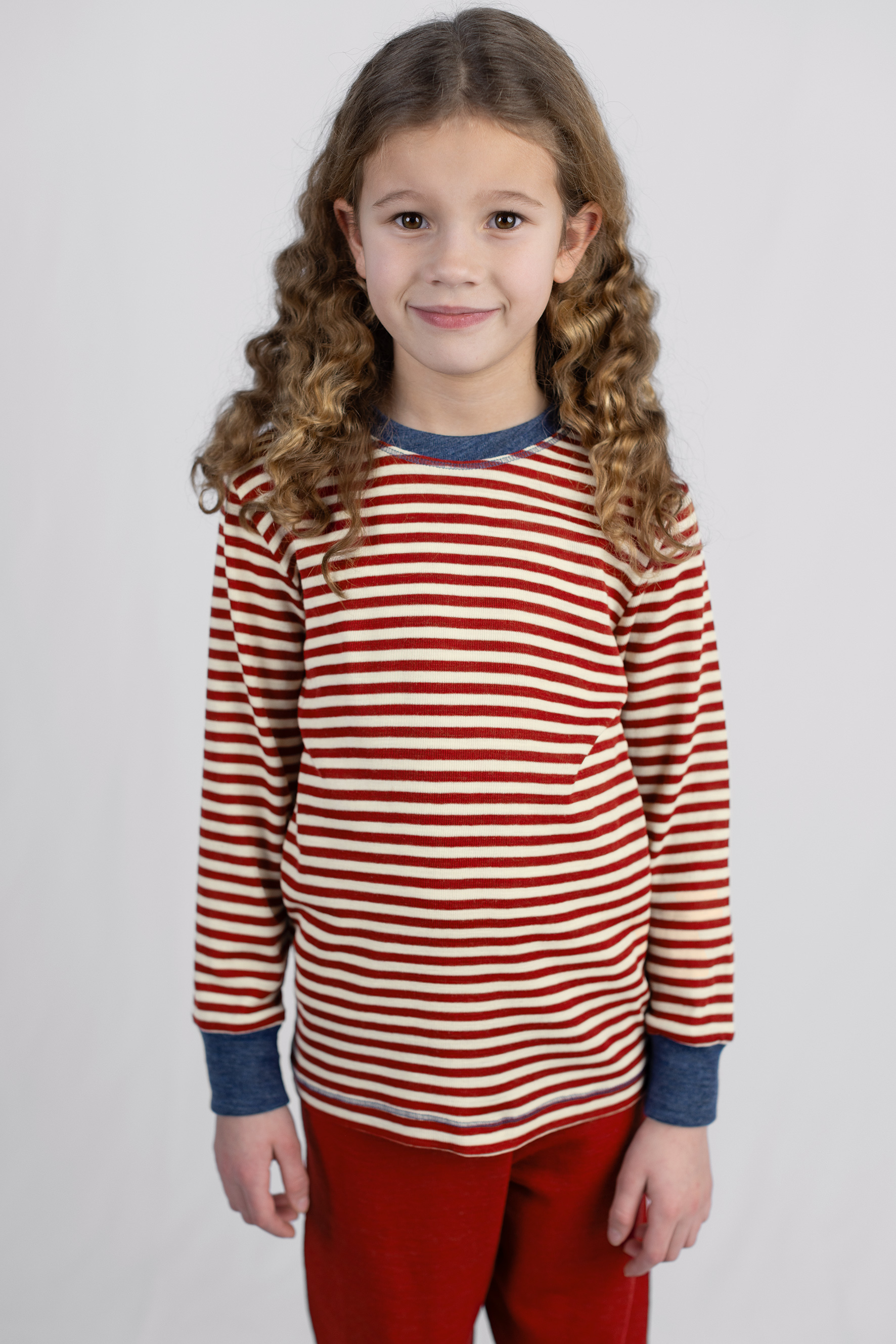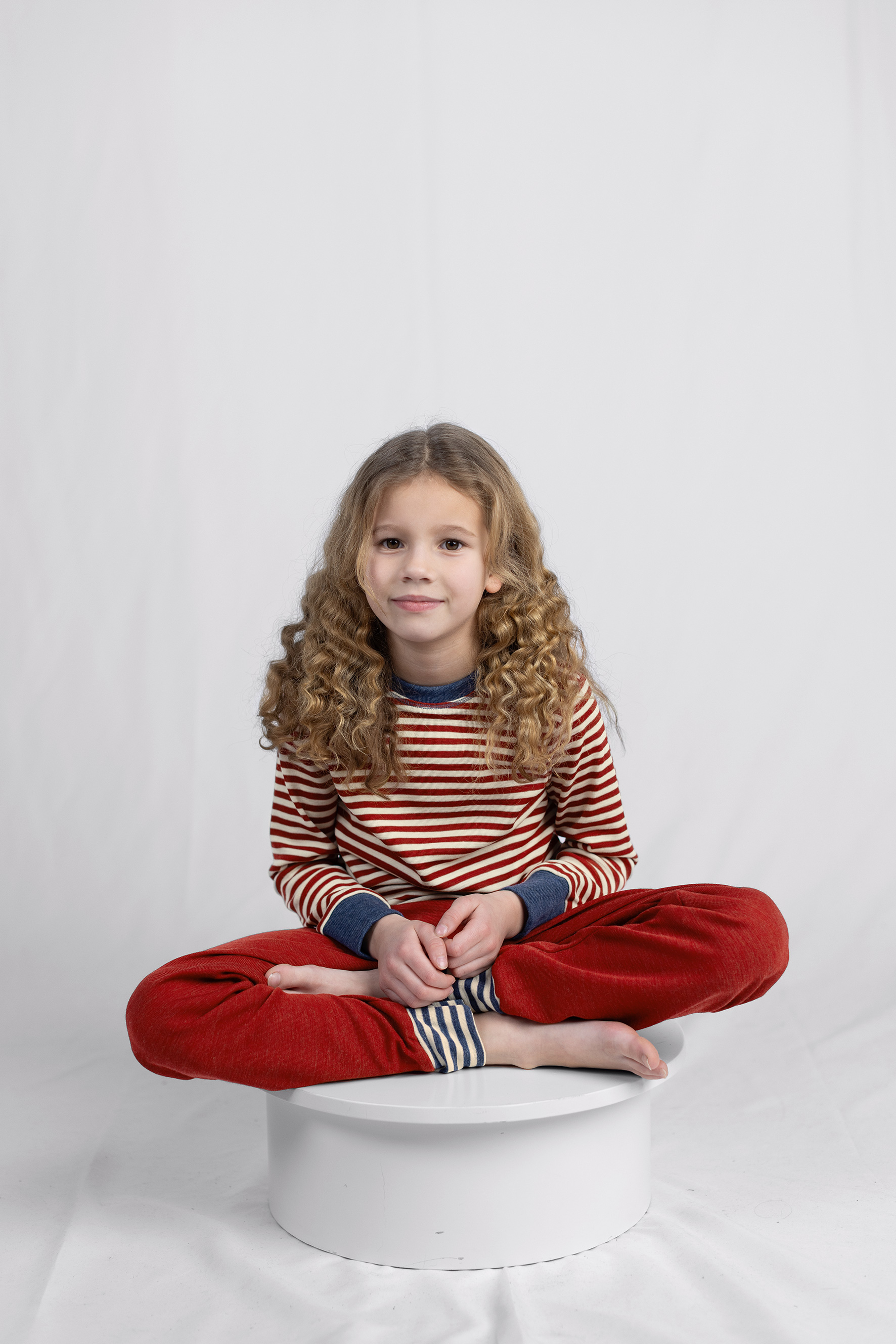 Streifen gehen immer: Den Kinder-Pullover in Feinripp-Qualität und 100% Bio-Merinoschurwolle gibt’s sowohl rot-weiß als auch blau-weiß gestreift. Perfekt passt dazu beispielsweise die bequeme Hose mit Ringelbündchen. Ob als Schlafanzug oder gemütlicher Zweiteiler für Zuhause: Das legere Outfit bietet garantiert Wohlfühlmomente.