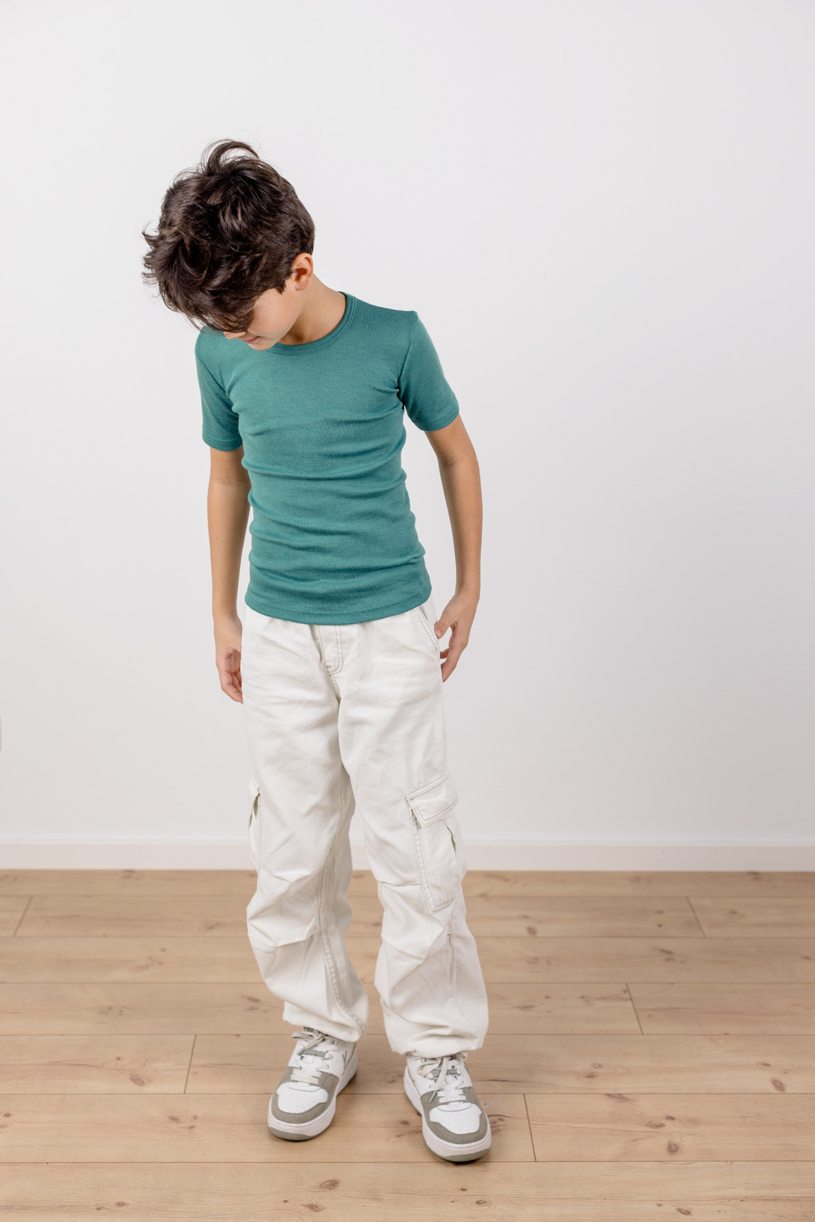 Bequemer Begleiter für jeden Tag: Das Kinder-Shirt mit kurzem Arm aus 70% Bio-Merinoschurwolle und 30% Seide gehört in jeden Kinderkleiderschrank. Das Hemd liegt angenehm sanft an, kratzt nicht und ist das optimale Kleidungsstück, egal ob zum Schlafen, Spielen oder Toben. Die Feinrippstruktur sorgt für einen hohen Tragekomfort. Perfekt für den Zwiebellook: Es kann als Unterhemd oder temperaturausgleichendes T-Shirt getragen werden! In vielen verschiedenen Farben erhältlich.