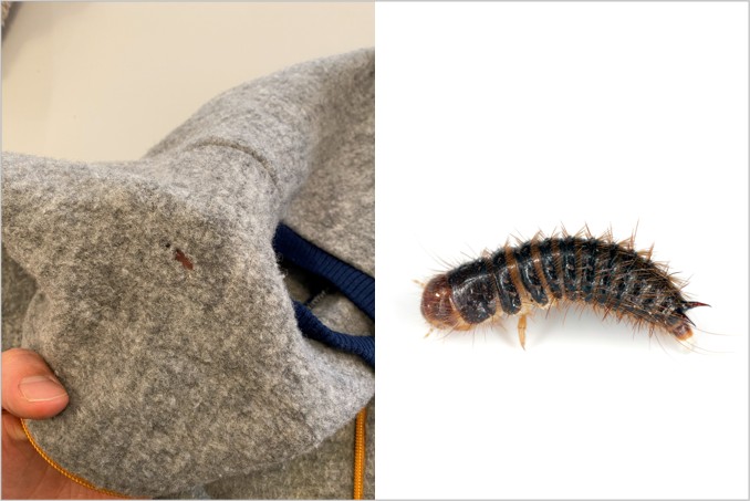 Neben der Kleidermotte kann auch der Pelzkäfer (Dermestes lardarius) Schäden anrichten. Seine Larven hinterlassen unregelmäßig geformte Löcher und bevorzugen ebenfalls organische Materialien wie Wolle, Felle oder Federn. Der Befall wird oft durch abgelegte, selten getragene Kleidung begünstigt – insbesondere, wenn sie Hautschuppen oder Haare enthält, die den Larven als zusätzliche Nahrungsquelle dienen.